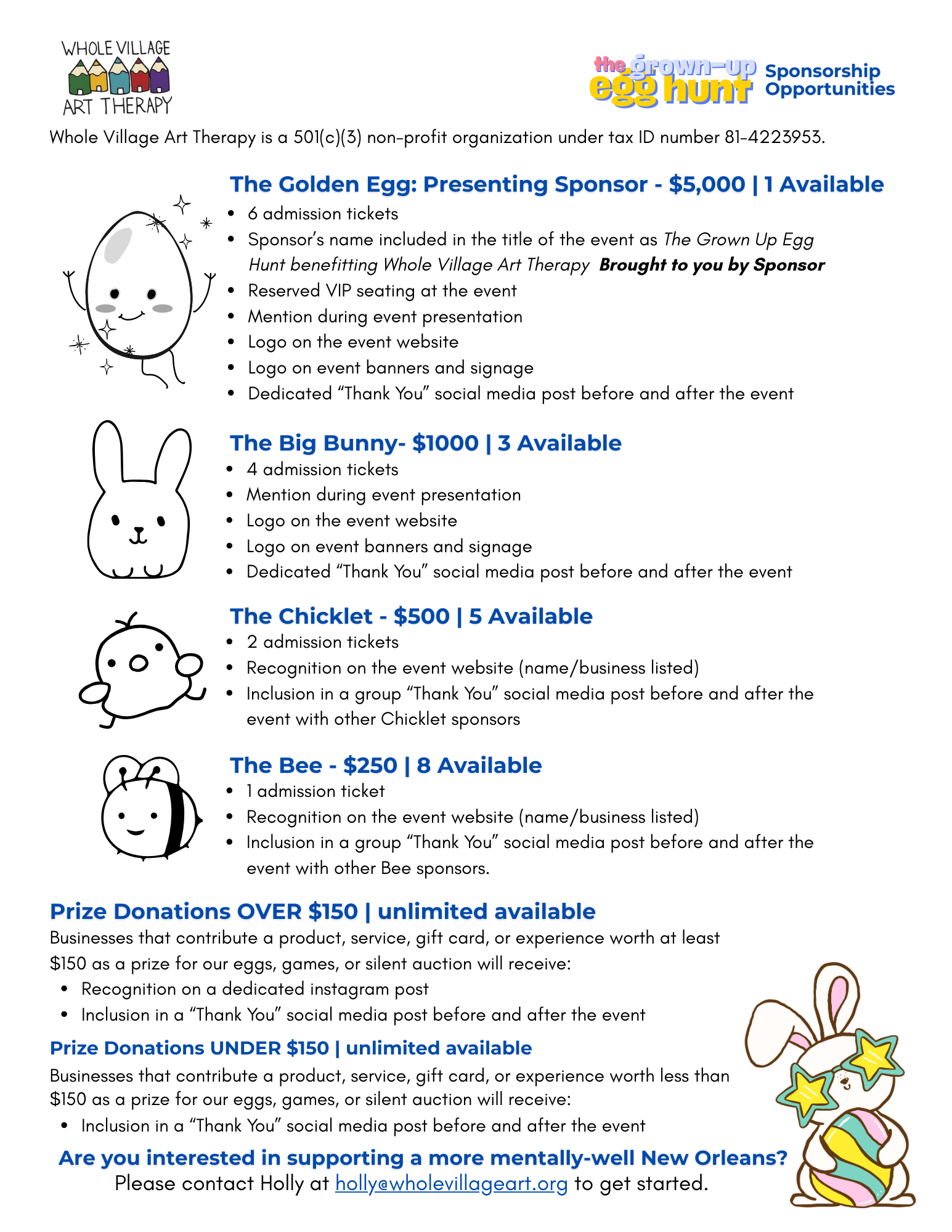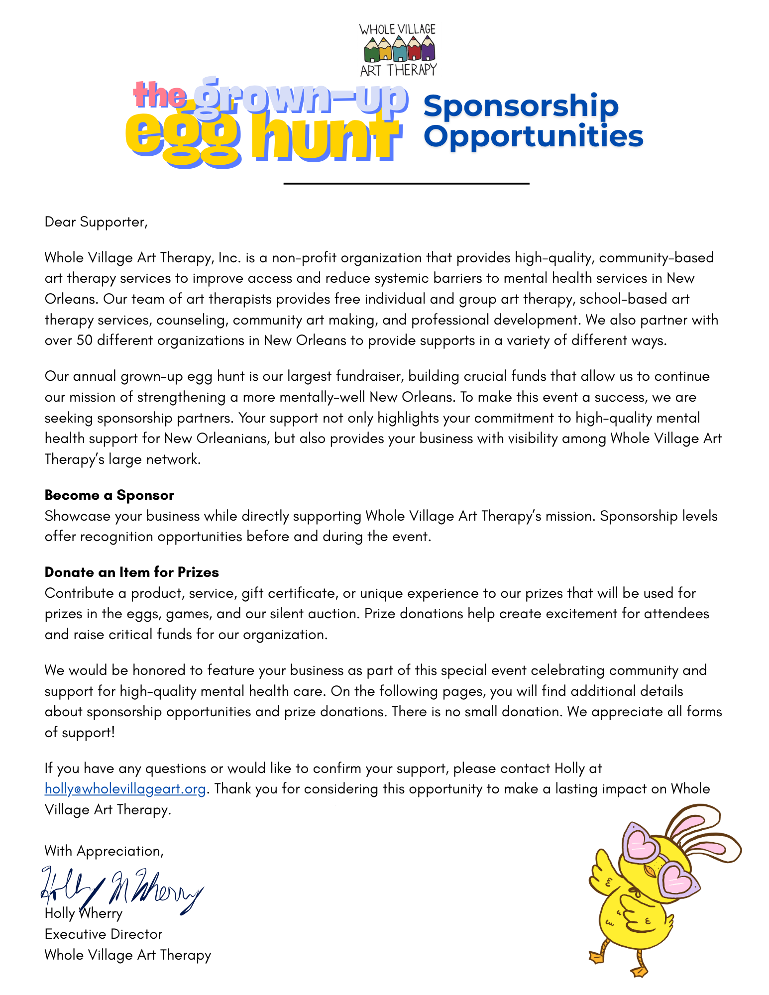 Thank you for considering supporting Whole Village Art Therapy! Contact Holly for more details and payments. We appreciate all of your support! holly@wholevillageart.org or 504-323-5278